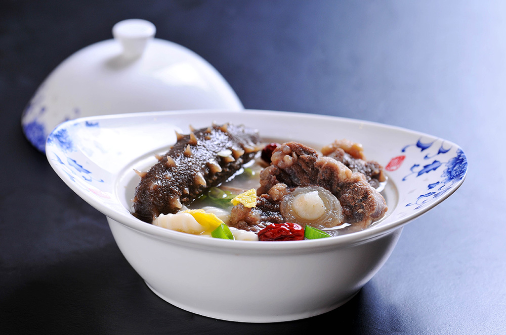 3.水發刺參焯水,放入牛尾湯中煲制,待牛尾熟爛時加入面疙瘩、蒜片、枸杞、紅棗、菜心,加鹽、味精、料酒調味,出鍋,撒上香蔥末即可。