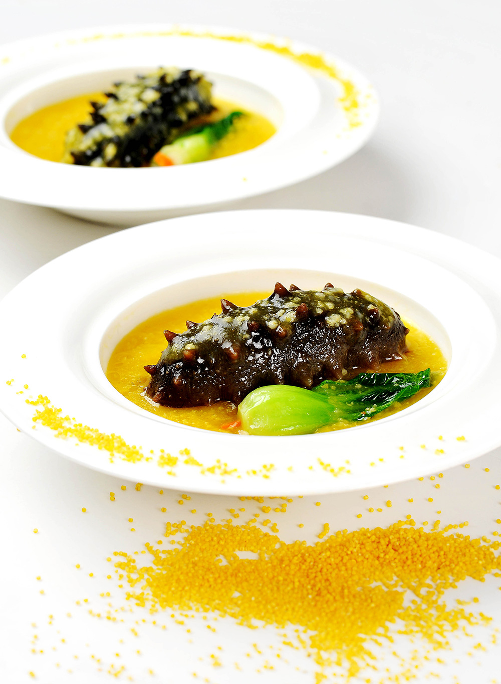 2.把發(fā)好的海參用上湯煨制入味,放入盤中,澆入煲好的米湯即可。